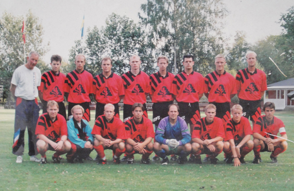 Lennart Rönnqvist, lagledare, Tomas Moström, Karl-Johan Hjertén (hette Lundgren då), Lars-Åke Carlsson, Ulf Carlsson, tränare Ola Andersson, Patrik Sörensson, Johan Samuelsson och lagledare Magnus Gabriellson